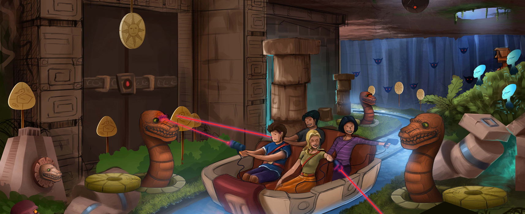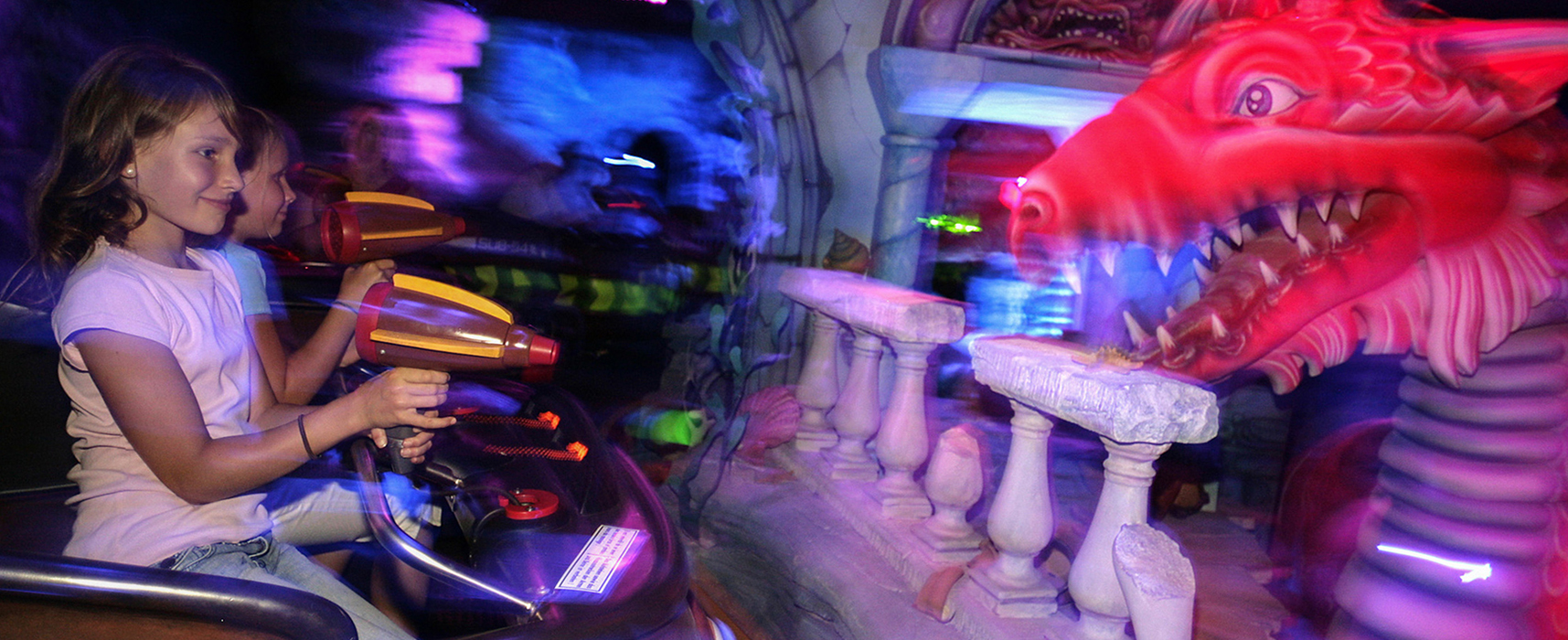 以射击标靶为主,游客坐在装有激光感应枪的轨道车上,对场景内的标志进行瞄准射击,在精心打造的情景环境中,游客通过射击不同分值的标靶累计积分获得称号成就,游戏最后出现积分榜,与其他玩家进行比拼。